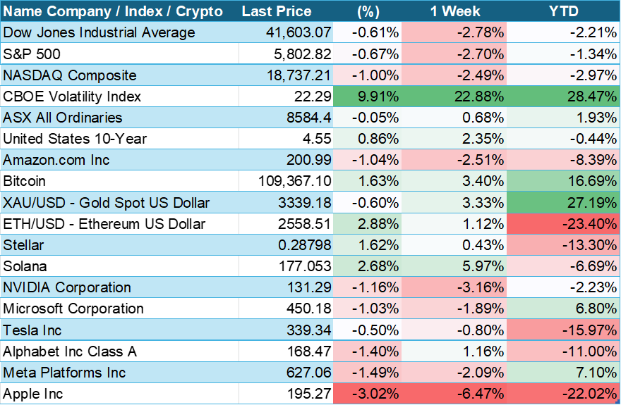 US stock markets closed lower last week with the main US benchmarks closing down 2.78% last week on the back of renewed concerns regarding Trumpās trade tariffs on the EU and Apple.