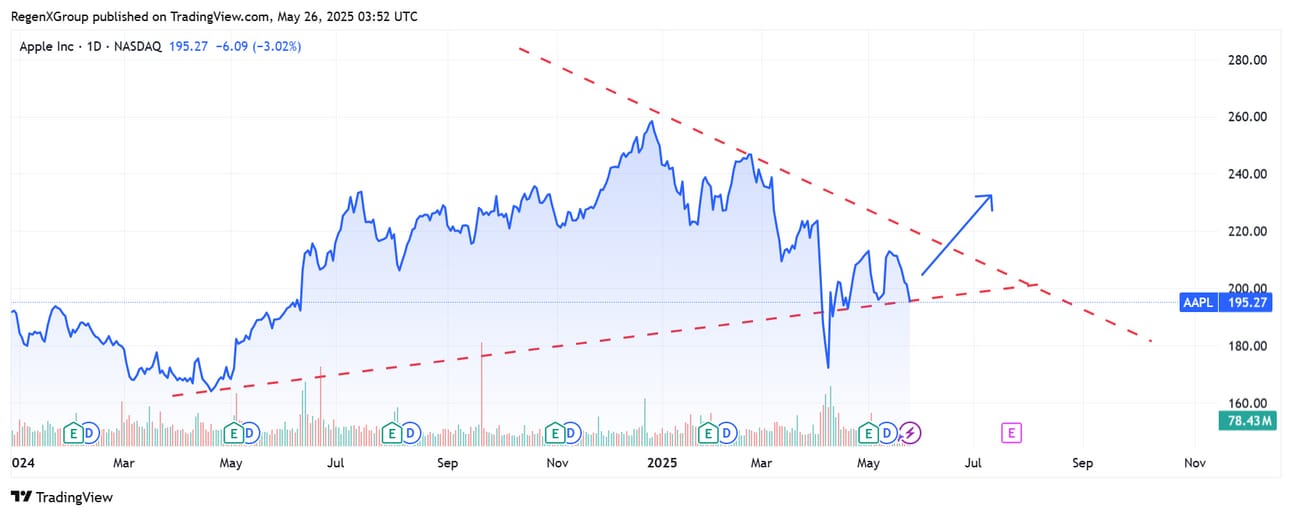 Our thoughts: Based on Trumpās past behaviour, we expect him to eventually walk back these threats as cooler heads prevail. It appears the administration's goal is to pressure Apple to shift production away from China, rather than actually implement tariffs. We donāt believe these tariffs will be enforced, as the broader economic fallout would be significant. Looking at the chart below Apple is at a technical inflection point. A breakout above the descending resistance could shift momentum bullish, with targets in the $220ā$240 range. However, traders should watch for confirmation with volume and macro headlines, particularly related to tariffs and supply chain developments. At these levels, we think Apple is good value.