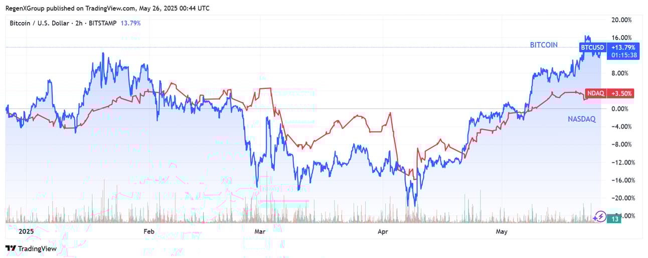 Despite all the tough tariff talk, Bitcoin continues to push higher and higher. Itās clear now that Bitcoin has significantly outperformed the NASDAQ Index. In early 2025, Bitcoin and the NASDAQ showed moderate positive correlation, moving largely in tandem through January and February. However, by late April into May, Bitcoin broke out sharply, gaining over +13.7% YTD, while NASDAQ posted a more modest +3.5% return. This divergence suggests a decoupling of risk appetite, with Bitcoin attracting momentum capital likely driven by macro uncertainty, inflation hedging, or demand for alternative stores of value. Bitcoin continues its bullish momentum, setting new all-time highs and contributing to a surging crypto market cap of $2.21 trillion.