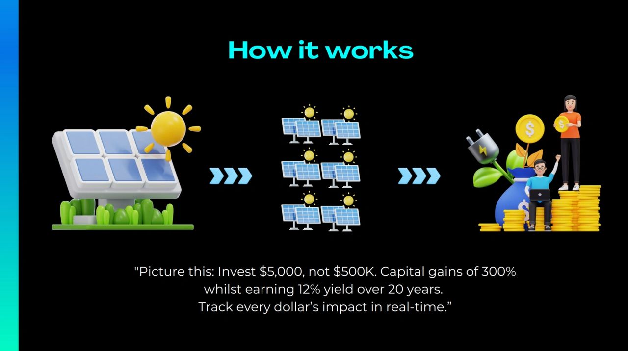 Let’s take for example a large-scale solar farm in regional Australia that produces clean energy for local communities listed on ReFi investment platform, RegenX. Using the ReFi model, investors can invest directly into the project and receive a portion of the revenue generated from selling electricity to the grid, which provides them with regular financial yield of 9%.